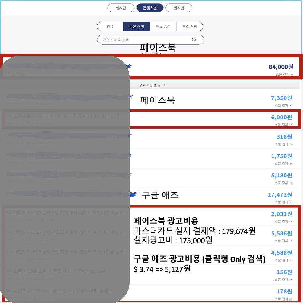 페이스북 광고집행 후 수익은 총 90,000원 [ 84,000원(승인대기금액) + 6,000원(유효승인금액) ]